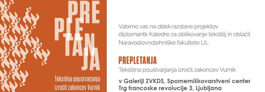 Vabljeni na razstavo in delavnice Prepletanja – poustvarjanje izročil zakoncev Vurnik, razstavo diplomantk Katedre za oblikovanje tekstilij in oblačil, NTF UL, v Galerijo ZVKDS Spomeniškovarstveni center, Trg francoske revolucije 3, Ljubljana.
