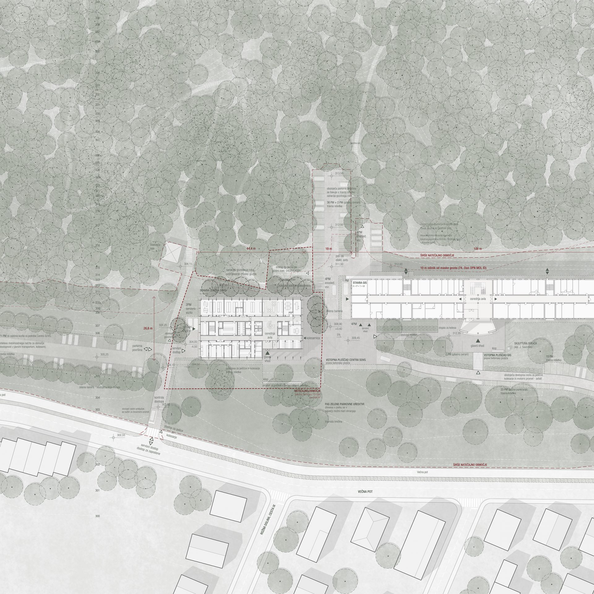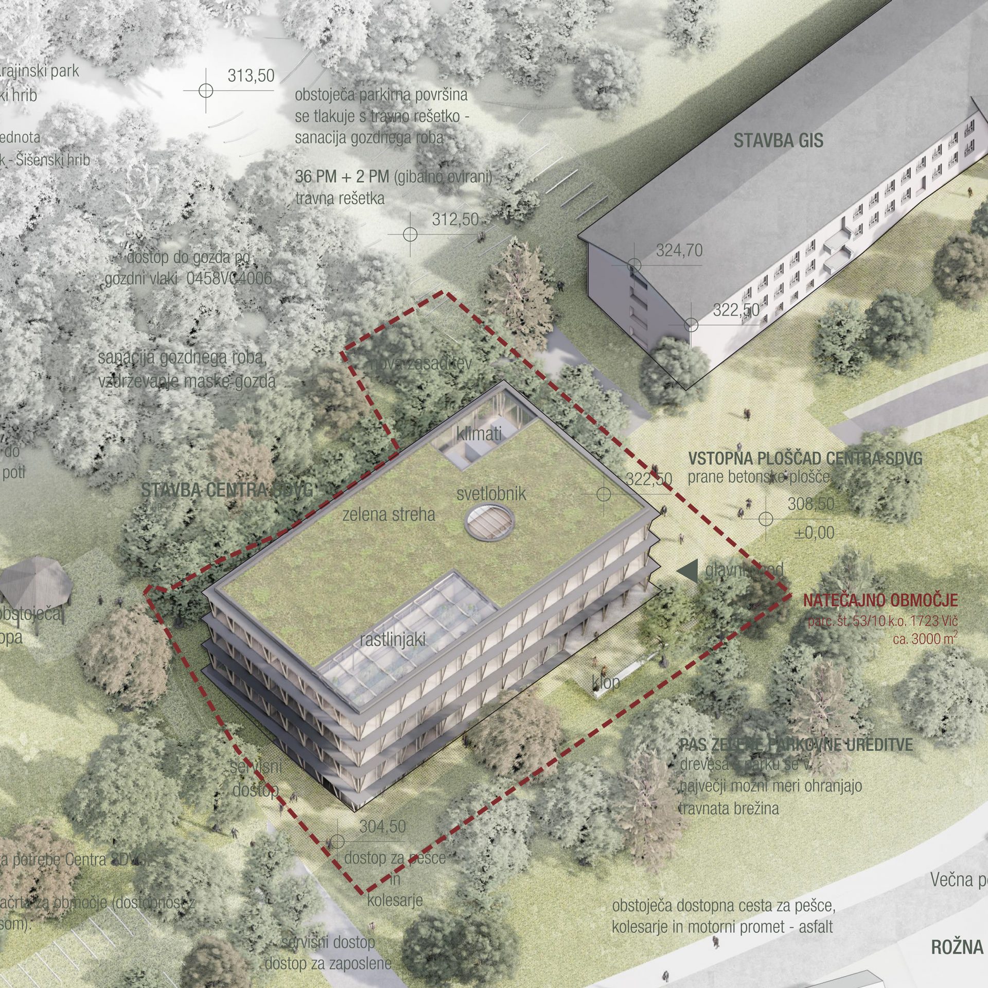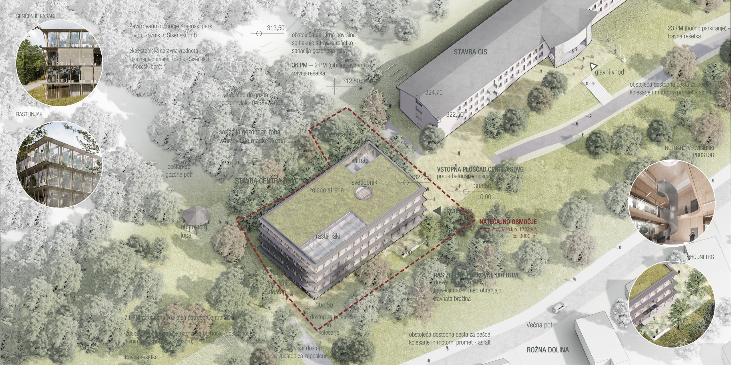 Predmet projektnega natečaja je zasnova novega objekta – Centra SDVG, na lokaciji obstoječega rastlinjaka z laboratoriji, ki bo odstranjen in nadomeščen z novogradnjo. Predvidena je izgradnja cca 3.000 m2 neto površin za potrebe Oddelka za gozdno fiziologijo in genetiko ter Oddelka za varstvo gozdov, vključno z zunanjo in prometno ureditvijo. V sklopu natečaja je potrebno izdelati tudi zasnovo celovite prometne ureditve znotraj kompleksa gozdarskega inštituta.