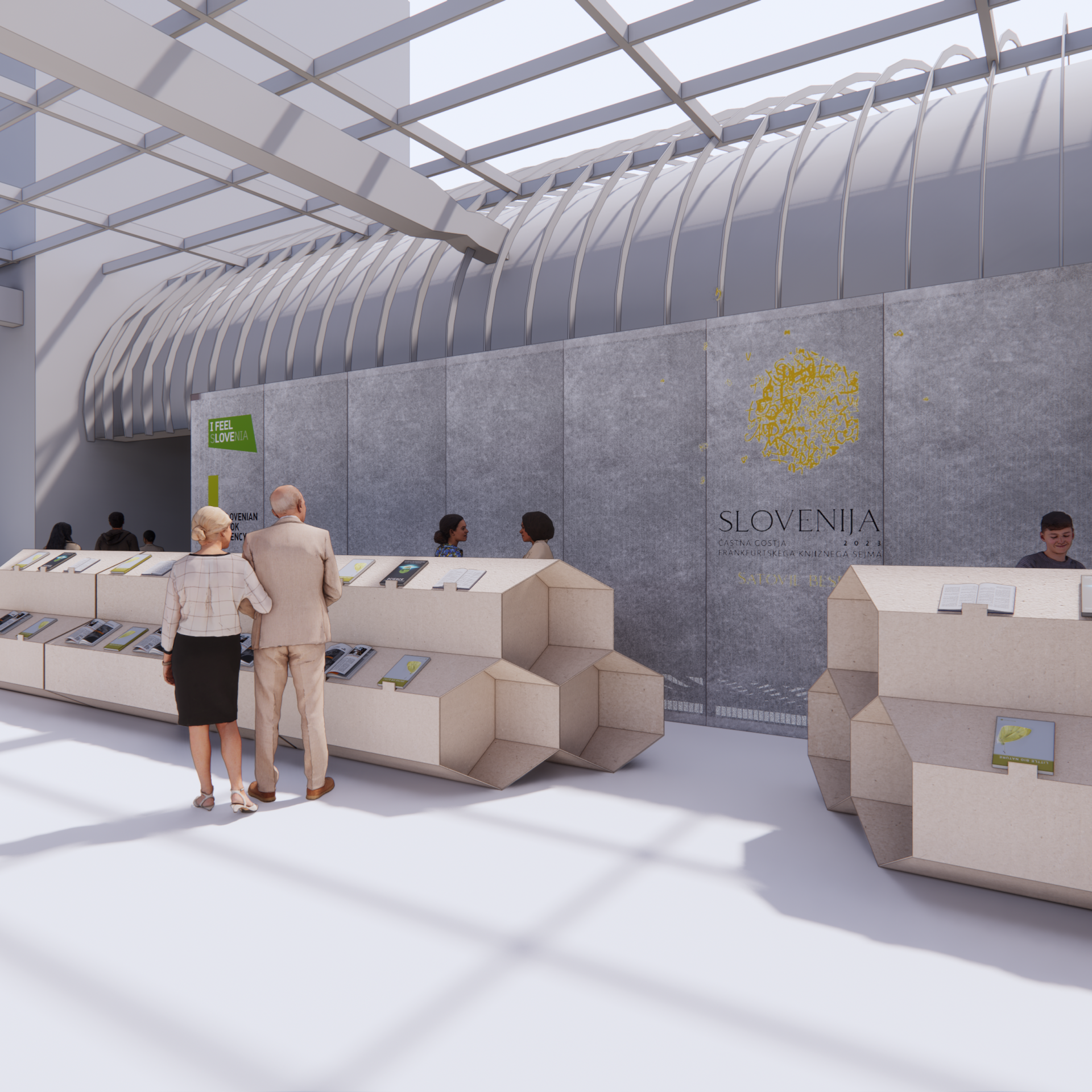 Predmet projektnega natečaja: Slovenija bo na mednarodnem knjižnem sejmu v Frankfurtu oktobra leta 2023 predstavljena kot častna gostja. Za to posebno priložnost, na kateri se predstavlja slovenska literatura, kultura in dežela, je potrebno zasnovati paviljon Slovenije, častne gostje, ter slovensko stojnico.