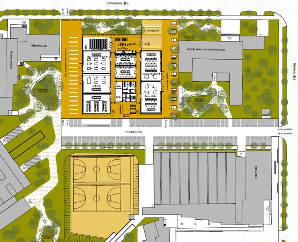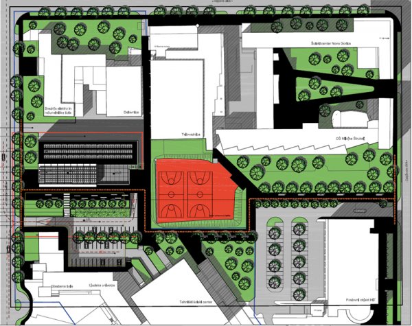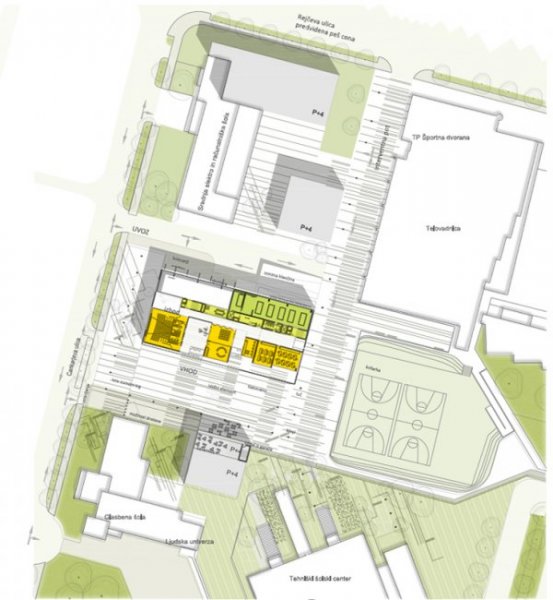 - z ustrezno zasnovo zunanje ureditve zagotovile ustrezne pogoje in prostor za zadrževanje obiskovalcev na ustrezno urejenem trgu ali ploščadi med objekti TŠC,