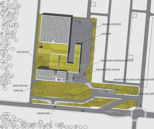 The location for the new business complex in Beričevo is foreseen as the existing ELES buildings intended for demolition. The new commercial building complex for the implementation of operational activities shall comprise a total of almost 12,000 m2. It is composed of two programme packages that comprise different, not necessarily functionally interrelated activities: